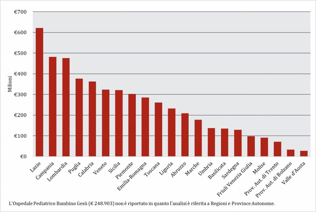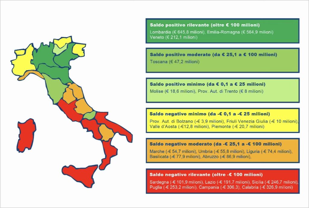 - Saldo negativo rilevante: Sardegna (-€ 101,9 milioni), Lazio (-€ 191,7 milioni), Sicilia (-€ 246,7 milioni), Puglia (-€ 253,2 milioni), Campania (-€ 306,3 milioni), Calabria (-€ 326,9 milioni)