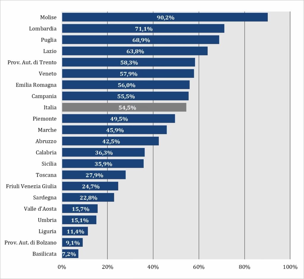 - Saldo negativo minimo: Provincia autonoma di Bolzano (-€ 3,9 milioni), Friuli Venezia Giulia (-€ 10 milioni), Valle d’Aosta (-€ 12,8 milioni), Piemonte (-€ 20,7 milioni)