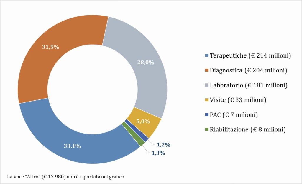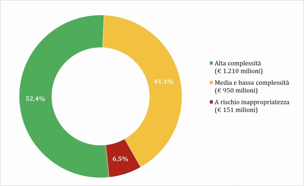 Secondo i dati Agenas, l’80,4% della mobilità per ricoveri è classificato come effettiva (€ 2.311 milioni), ovvero dipende dalla scelta del paziente. Il 16,7% (€ 480 milioni) è invece legato a prestazioni urgenti (mobilità casuale) e il 3% (€ 85 milioni) riguarda casi in cui il domicilio del paziente non coincide con la Regione di residenza (mobilità apparente). Della mobilità effettiva, solo il 6,5% riguarda ricoveri ordinari a rischio di inappropriatezza (figura 5). Della specialistica ambulatoriale erogata in mobilità, quasi il 93% si concentra in tre categorie: prestazioni terapeutiche (33,1%), diagnostica strumentale (31,5%) e prestazioni di laboratorio (28%) (figura 6).